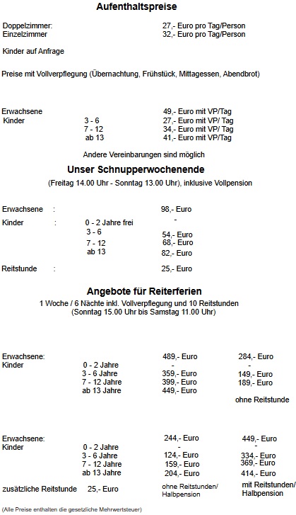 Neiße-Malxetal (Niederlausitz): Doppelzimmer: 27,- Euro pro Tag/ Person. Einzelzimmer: 32,- Euro pro Tag/ Person Reiterhof und Pension zum Rappen in Neiße-Malxetal in der Niederlausitz.