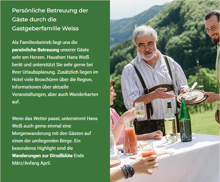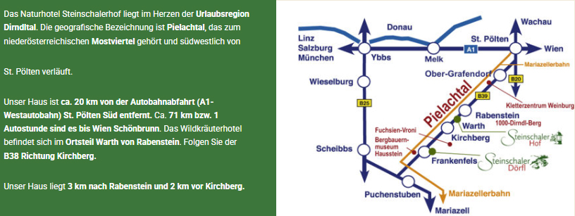 Steinschaler Naturhotels ![]() Steinschaler Dörfl - Frankenfels Steinschalerhof - Warth Urlaub, Seminare und Ausflugsziel im Dirndltal - Niederösterreich Die Öffnungszeiten unseres Steinschaler Restaurants können variieren. Wenn Sie unsere Kulinarik genießen möchten, bitten wir Sie um einen kurzen Anruf unter 02722 2281. Eingebettet in die hügelige Landschaft des niederösterreichischen Mostviertels, liegen die Steinschaler Naturhotels im Herzen der Urlaubsregion Dirndltal. Namensgebend für das Dirndltal, das sich – südlich von St. Pölten – entlang der Pielach erstreckt, sind die vielen tausend Dirndl-Bäume. Zwei Standorte - Steinschalerhof & Steinschaler Dörfl Der Steinschalerhof liegt gut erreichbar in Warth im Tal und ist ein beliebtes Ausflugs- und Urlaubsziel. Unsere Gäste schätzen unsere einzigartige Wildkräuter-Küche. Die Wildkräuter kommen aus unseren eigenen Steinschaler Gärten, die jedem Besucher offenstehen. Das Steinschaler Dörfl ist unser Resort für Gruppen bis zu 500 Personen. Unser Dörfl liegt abgeschieden vom Lärm der Welt auf einem Berghang in der Nähe von Frankenfels. Das Dörfl ist der richtige Ort für Seminare, Feiern und Incentives. Und das Beste daran: Sie können sogar das ganze Dorf samt Dorfplatz und Dorfwirtshaus mieten! ![]() ![]() Wildkräuterhotel Steinschalerhof