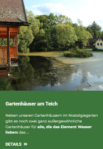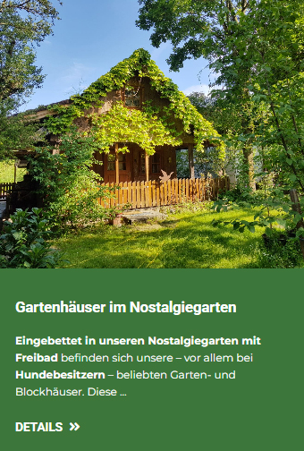 Gartenhäuser im NostalgiegartenEingebettet in unseren Nostalgiegarten mit Freibad befinden sich unsere – vor allem bei Hundebesitzern – beliebten Garten- und Blockhäuser. Diese Häuser haben einen rustikal gemütlichen Charme. Ihr Vorteil: Sie wohnen in Ihrem eigenen Haus mit eigenem kleinem Vorgarten. Für die Romantik haben wir in einigen Gartenhäusern – zusätzlich zur Zentralheizung – selbst beheizbare Schwedenöfen eingebaut. Unsere Gartenhäuser sind mit einer kleinen Küche ausgestattet. Für alle, die es bequem wollen, liegt unser Restaurant in unmittelbarer Nähe. Ausstattung