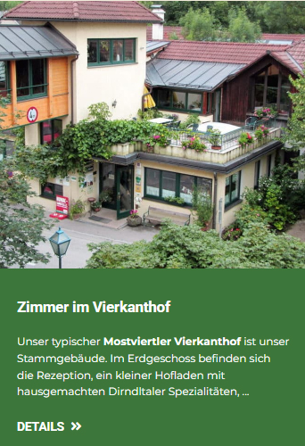 Zimmer im VierkanthofUnser typischer Mostviertler Vierkanthof ist unser Stammgebäude. Im Erdgeschoss befinden sich die Rezeption, ein kleiner Hofladen mit hausgemachten Dirndltaler Spezialitäten, das Frühstücksbuffet sowie das Restaurant. Bei schönem Wetter gibt es auch Plätze im Innenhof, auf der Gartenterrasse und in der Pfluaghittn. Im 1. Stock finden Sie eine Bibliothek, in der Sie sich nicht nur Bücher leihen können, sondern die auch zum gemütlichen Verweilen einlädt. Ausstattung