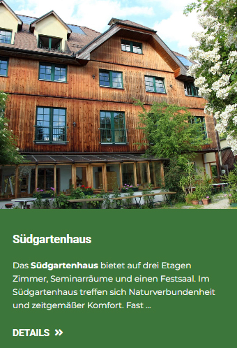 SüdgartenhausDas Südgartenhaus bietet auf drei Etagen Zimmer, Seminarräume und einen Festsaal. Im Südgartenhaus treffen sich Naturverbundenheit und zeitgemäßer Komfort. Fast alle Zimmer sind mit Whirl-Badewannen ausgestattet, einige auch mit privater Infrarot-Kabine. Spezielle „Mostviertler Genießerzimmer“ sind extragroß und für Romantiker gibt es auch Zimmer mit Himmelbett. Für alle, die es bequem mögen oder für Gäste mit besonderen Bedürfnissen, gibt einen Lift. Einige Zimmer sind auch speziell für Gäste mit besonderen Bedürfnissen, eingerichtet. Alle unsere Zimmer haben, zusätzlich zur Zimmernummer, einen Pflanzennamen. Dabei ist die 1. Etage den Kräutern gewidmet, die 2. Etage den Speiseblüten und das Dachgeschoß den Wildfrüchten. Unsere Verbundenheit mit der Mariazellerbahn bringen wir unter anderem auch mit dem Gemälde von Robert Trimmel auf der Ostseite des Südgartenhauses zum Ausdruck. Ausstattung