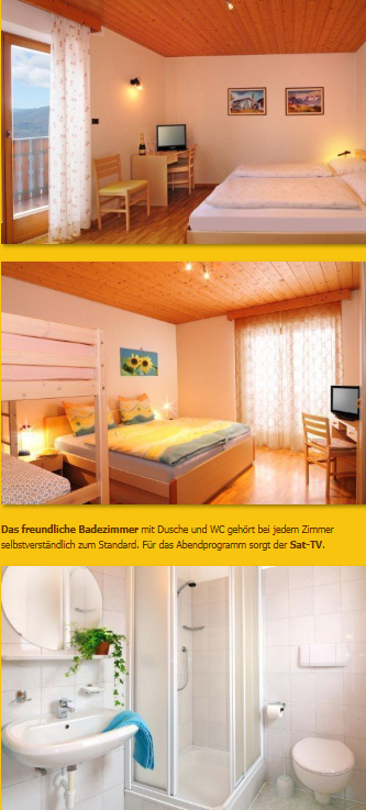 Rastlhof - Urlaub auf dem Bauernhof im Meraner Land (Südtirol) ![]() Der Rastlhof – Ihr Bauernhof im Meraner Land heißt Sie mit seinen wunderschönen Ferienwohnungen und Gästezimmern Mölten / Meraner Land aufs Herzlichste willkommen. Erleben Sie einen Traumurlaub im Herzen Südtirols, umgeben von einer alpinen Landschaftskomposition, wie man sie eigentlich nur aus Reisekatalogen her kennt. Der strahlend blaue Himmel, die blühenden Bergwiesen, tiefgrüne Wälder und die majestätischen Bergriesen der Dolomiten bilden den Rahmen für Ihren naturnahen Bauernhofurlaub im Südtirol. Unser idyllischer Bauernhof im Meraner Land liegt auf 1.240 Meter über dem Meeresspiegel und ist ein optimaler Ausgangspunkt, um zu unvergesslichen Wanderungen aufzubrechen. Erleben Sie Südtirol von seiner schönsten Seite, und freuen Sie sich auf paradiesische Urlaubstage im Rastlhof. Rastlhof – Neu erbauter Bauernhof in Mölten / Meraner Land ![]() Das Bauernhaus mit den Doppelzimmern und der geräumigen Ferienwohnung auf dem Bauernhof strahlt bodenständiges Flair aus. Natürlich hat sich Ihre Gastfamilie strikt an den traditionellen Südtiroler Baustil gehalten – das verbaute Holz wurde in unseren heimischen Wäldern geschlagen und strahlt im Innen- und Außenbereich ein warmes Wohnambiente aus. Bergdorf Mölten – Südtirol ![]() Der Rastlhof mit seinen schönen Ferienwohnungen und Gästezimmern in Mölten / Meraner Land liegt ca. 20 Gehminuten vom Ortskern des idyllischen Bergdörfchens Mölten entfernt. Hoch über der romantischen Stadt Bozen gelegen, hat man von Mölten aus einen herrlichen Rundblick über die traumhafte Bergkulisse der Dolomiten. Der Tschögglberg wacht mit seinen schneebedeckten Gipfeln über das pittoreske Dorf und seine herzlichen und gastfreundlichen Bewohner. Im Dorf selbst finden unsere Gäste alles, was sie für einen individuellen Urlaub auf dem Bauernhof im Meraner Land benötigen. Der Tschögglberg – “Bozens Sonnenseite” ![]() Der Tschögglberg ist ein Gebirgskamm, der von Meran bis nach Bozen reicht. Die Ferienwohnung und Gästezimmer Mölten / Meraner Land des Rastlhofs liegen am Fuße dieser majestätischen Gebirgskette. Den Beinamen „Bozens Sonnenseite“ trägt er zu recht, werden Gäste und Einheimische in dieser Region fast jeden Tag im Jahr von den wärmenden Sonnenstrahlen verwöhnt. Wanderwege, die sich sanft durch das Tal ziehen und wenig Steigung haben eignen sich hervorragen für Familien und Senioren. Wer hoch hinaus will, dem sind die spektakulären Bergtouren hoch hinaufauf den Tschögglberg anzuraten. Doch auch mit dem Mountainbike oder hoch zu Ross kann die bezaubernde Berglandschaft erkundet werden. Ferienwohnung Talblick Ferienwohnung Mölten – Meraner Land Schon beim betreten der gemütlichen Ferienwohnung, die den klangvollen Namen „Talblick“ trägt, werden Sie sich augenblicklich wohlfühlen. Die liebevolle Einrichtung, der tolle Schnitt und der sagenhafte Ausblick über die Bilderbuchlandschaft erschaffen ein Wohnflair, das Sie wie eine warme Umarmung empfängt. Zudem wir es Ihnen an modernem Komfort nicht fehlen. Die lauschige Wohnküche ist komplett eingerichtet – sie ist mit der bequemen Sitzecke, Sofa und TV das Herzstück der Ferienwohnung. Die kuschligen Federbetten in den Schlafzimmern sind Garanten für einen erholsamen Schlaf. ![]() Die Ferienwohnung „Talblick“ in Mölten – Meraner Land macht ihren Namen alle Ehre Die neue Ferienwohnung bietet alles, was Sie sich für einen individuellen Urlaub auf dem Bauernhof im Meraner Land wünschen. Die 80 m2 Wohnfläche ermöglicht ein harmonisches Beisammensein für zwei bis sechs Personen und ist somit ideal geeignet für Familien und Gruppen. In den drei getrennten Schlafzimmern finden Sie einen erholsamen Schlaf. ![]() Hier können sich unsere Gäste zurückziehen, wenn sie etwas Privatsphäre genießen möchten und ungestört Ihren Gedanken nachgehen wollen. ![]() Gelebt, gelacht, gespeist und gekocht wird im Herzstück der geräumigen Ferienwohnung Mölten / Meraner Land – in der Wohnküche. Die gut bestückte Küche hält alle Kochutensilien parat, die Sie zum Zubereiten köstlicher Gerichte benötigen. Die große Eckbank mit Esstisch bietet genügend Platz für die hungrigen Aktivurlauber. Von der gemütlichen Ausziehcouch aus können auch im Urlaub die Lieblingsserien im Sat-TV verfolgt werden. Das große Badezimmer ist mit Dusche, Waschbecken und Bidet ausgestattet. ![]() Als Schmalkerl können Sie von der Sitzgelegenheit vor der Wohnung aus den sagenhaften Ausblick über das Bergpanorama rund um den Rastlhof genießen. Individuell, gemütlich und frei! So erleben Sie jeden Tag in unserer Ferienwohnung Mölten. Genießen Sie den Moment, wenn Sie nach einem aktiven Tag an der frischen Bergluft nach Hause kommen – nach Hause zum Rastlhof. Zimmer mit Bauernfrühstück Die Gästezimmer im Rastlhof – bequem und heimelig Ihren Urlaub verbringen In den großzügig geschnittenen Gästezimmern werden Sie sich schon vom ersten Augenblick an wohlfühlen. Die gemütlichen Zimmer auf unserem Bauernhof Meraner Land überzeugen nicht nur mit der unvergesslichen Aussicht von den Balkonen auf das Unterland und zum Kalterersee, sondern auch mit den himmlisch weichen Betten, die süße Träume garantieren. ![]() Gesunde Stärkung für aktive Urlaubstage auf dem Rastlhof Das erste Mahl am Tage sollte reichhaltig und gesund sein! Die alte Lebensweisheit, dass man morgens wie ein Fürst speisen sollte, gilt natürlichauch auf dem Rastlhof – Ihrem Bauernhof Meraner Land. Für unsere Gäste, die sich für ihren Aktivurlaub im Meraner Land in unsere Gästezimmer eingebucht haben, ist ein vitales und reichhaltiges Frühstück enthalten. Hausgemachte Marmeladen, knackige Brötchen, frische Eier vom Hof, herzhafter Aufschnitt und würziger Käse – dies sind nur einige der vielen frischen Köstlichkeiten, die Sie sich jeden Morgen schmecken lassen können. Und wo könnte man bess